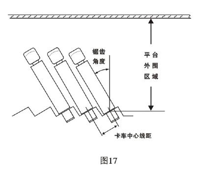 平臺外圍區(qū)域不足時,鋸齒形平臺是最佳選擇(圖1 7)。它可大大減少卡車靠泊或駛離裝卸區(qū)所需的外圍區(qū)域空間。