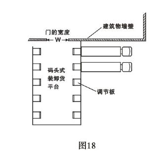 當(dāng)建筑物墻壁空間不足以設(shè)置平臺位置或建筑物及周圍通道布局使平臺不能沿墻壁周圍設(shè)置時,則可設(shè)計碼頭式平臺解決這一問題,此設(shè)計為確保叉車進(jìn)出順暢,門凈寬度應(yīng)在6米以上。(圖1 8 )